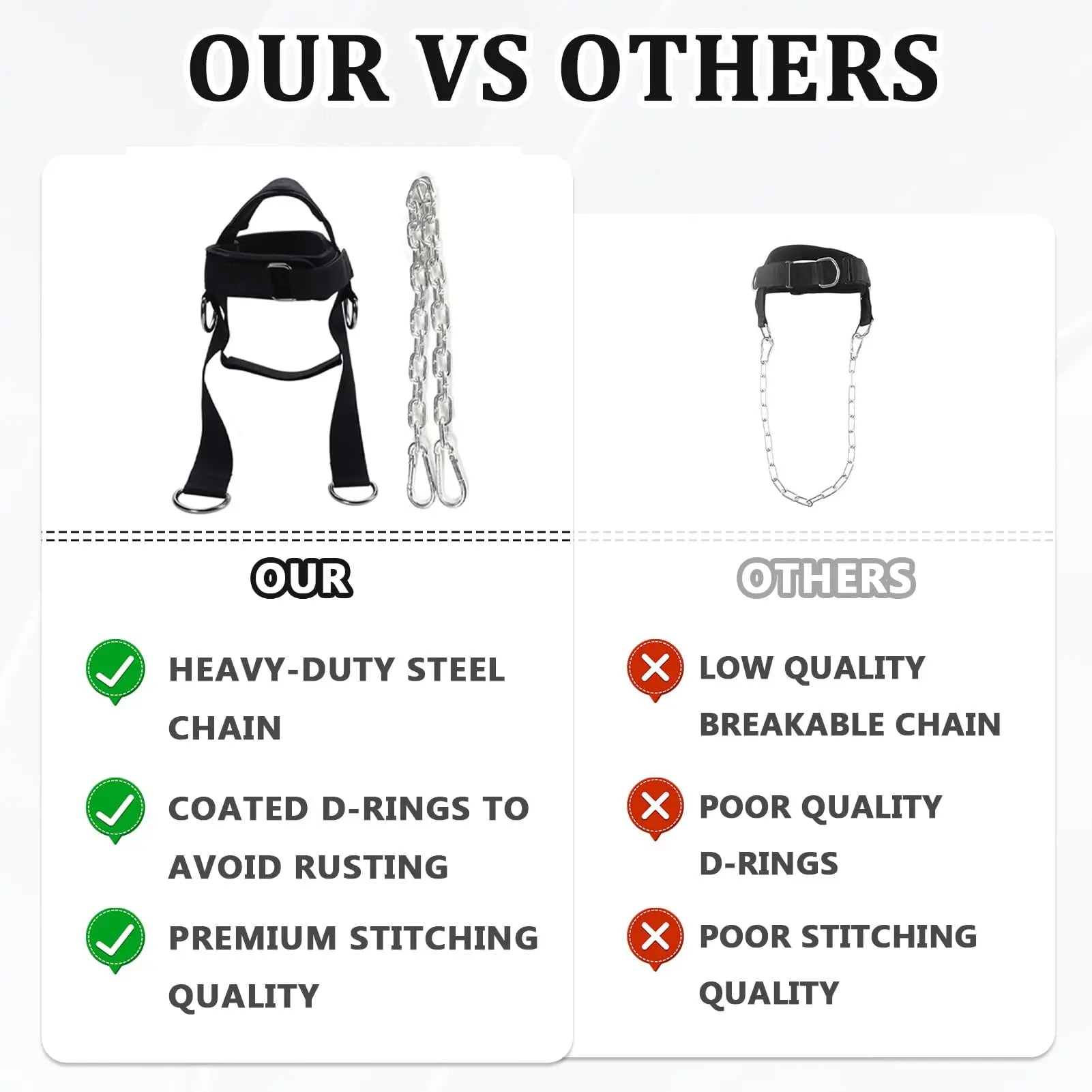 Feature 3: Adjustable Neck & Head Straps: This neck weight lifting harness will fit everyone regardless of their head size, thanks to the adjustable Hook & Loop head strap & neck strap.